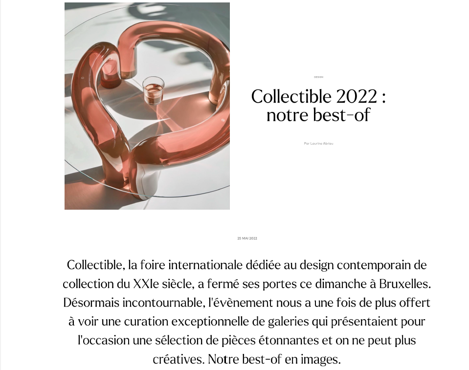 « Quel plaisir d’être enfin de retour à l’Espace Vanderborght pour une foire au format physique ! Nous avons tous pu constater à quel point notre communauté florissante de créateurs de design de collection avait besoin de se rassembler à nouveau et de renforcer ses liens. Nous ne pourrions être plus fiers de la plateforme que nous avons créée il y a cinq ans, aujourd’hui plus vivante et pertinente que jamais. » – Clélie Debehault et Liv Vaisberg, co-fondatrices de COLLECTIBLE.